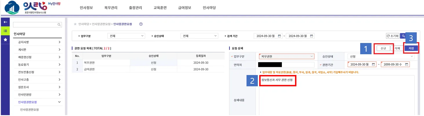 위와 같이 권한 요청을 해두고 전화 또는 쪽지로 “인사랑 권한 요청을 인사랑에 신청 해뒀습니다” 라고 말하면 된다