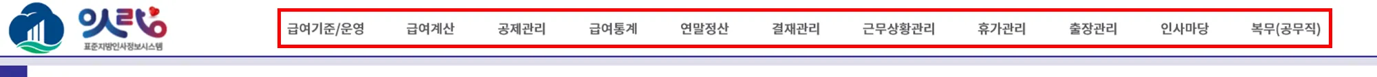 서무권한(복무, 급여)이 모두 승인된다면 아래처럼 인사랑 상단에 대메뉴가 아래처럼 바뀌게 된다.
