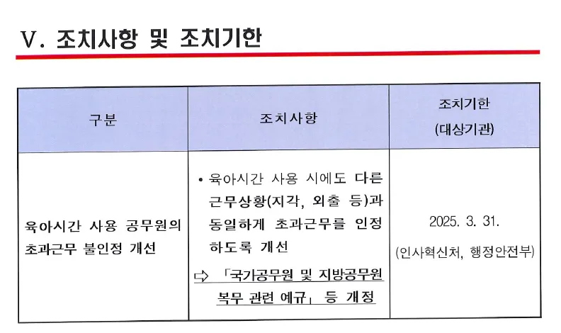 24년 8월, 국민권익위원회가 인사혁신처와 행정안전부 상대로 육아시간 사용 공무원의 초과근무 불인정 개선을 권고한 사항이다.