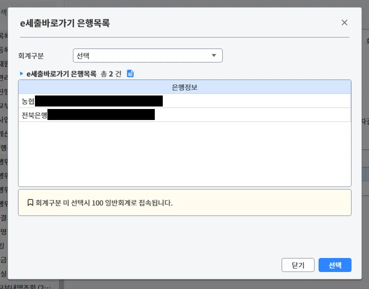 e세출바로가기 은행목록에 2가지의 은행이 있다. ( 농협 : 일반회계, 전북은행 : 특별회계 )