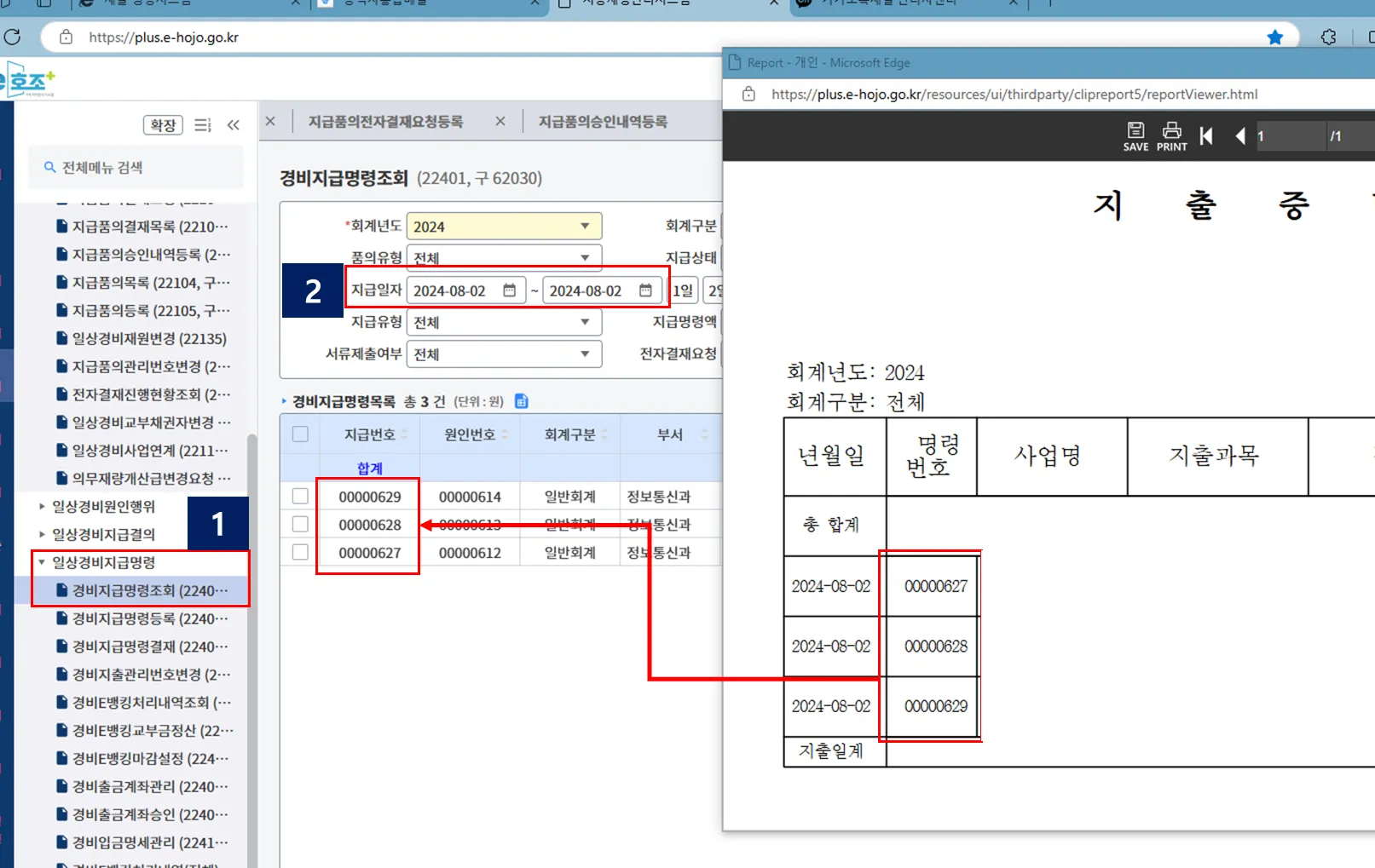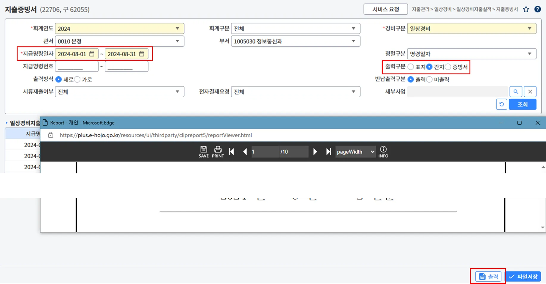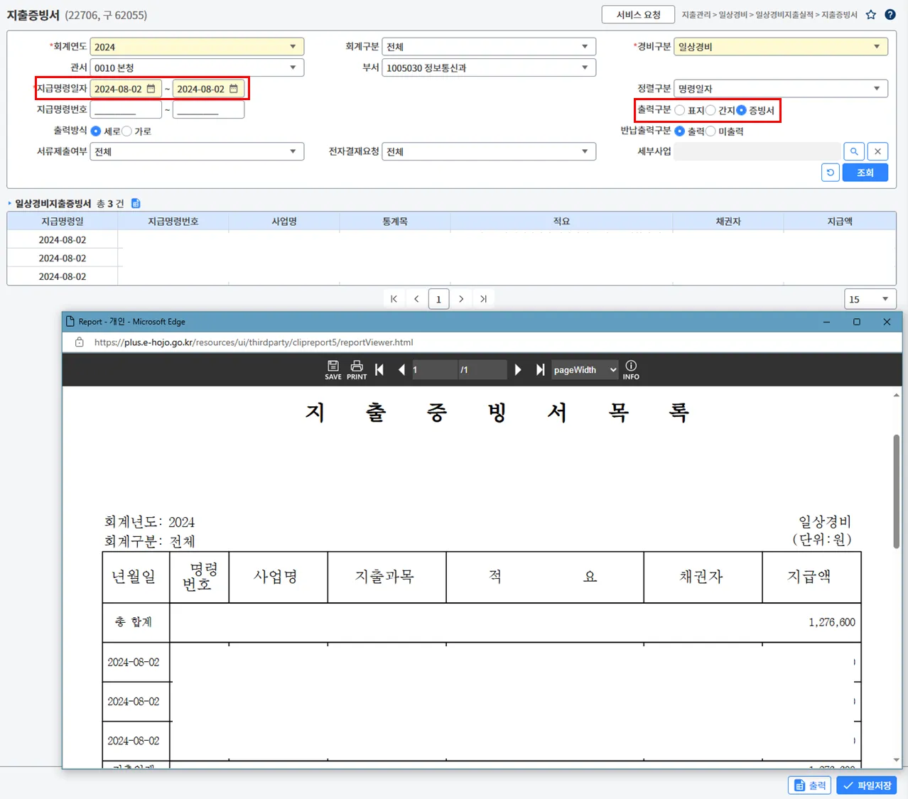 특정일자의 간지 / 증빙서(붉은색) / 지급명령(파란색) 인쇄가 끝났다면, 특정일자의 지출 건을 인쇄해야 한다.