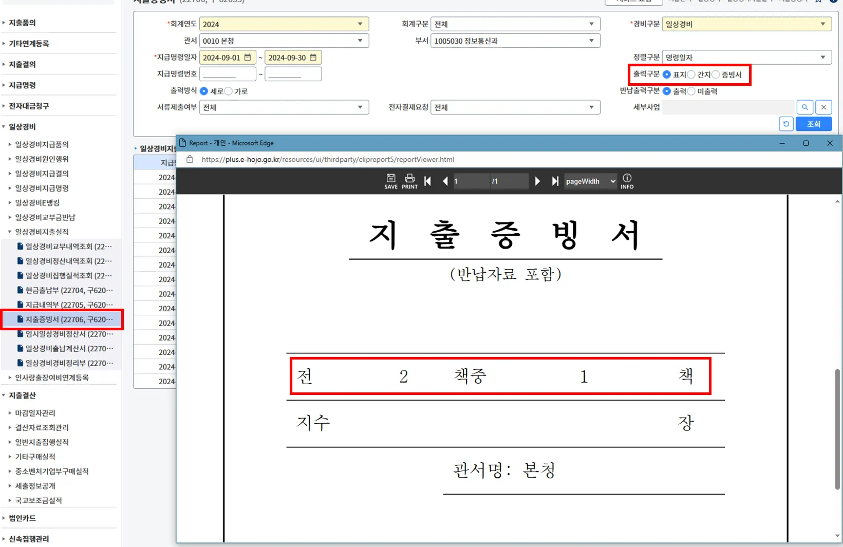 E호조는 법 근거에 맞게 표지, 목록 등을 출력할 수 있도록 이미 기능이 있다. (지출증빙서, 22706)