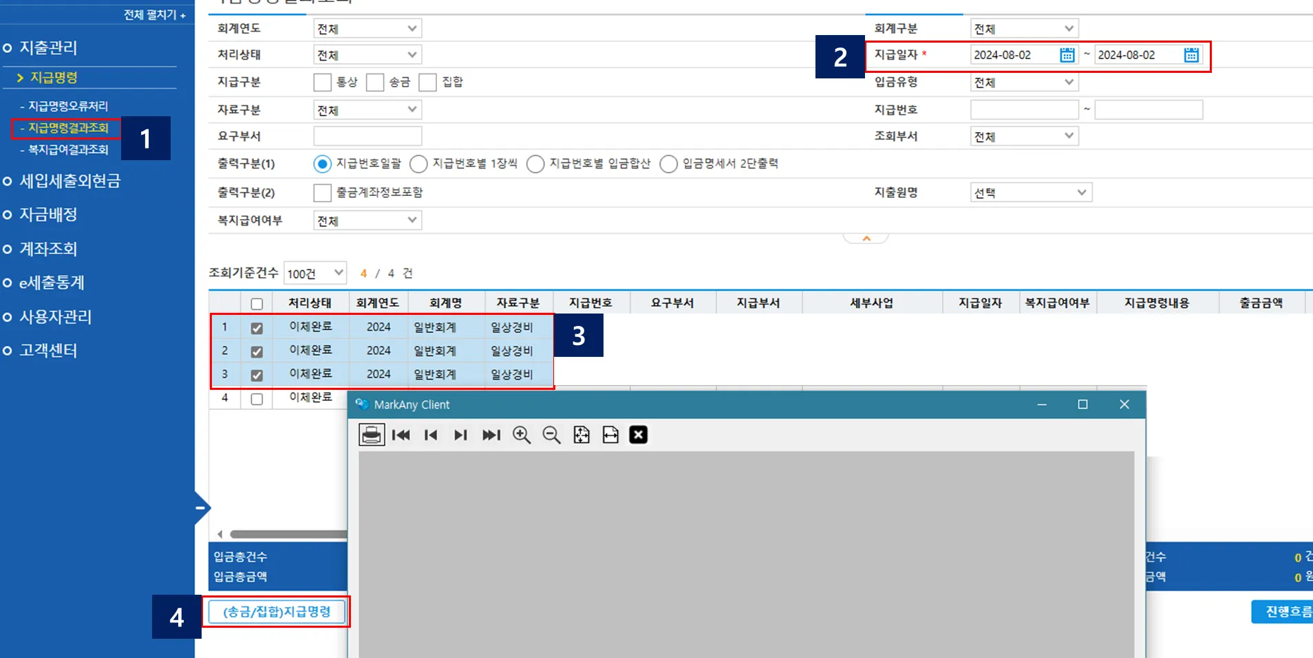 (1~2) 지출관리 > 지급명령 > 지급명령결과조회 > 지급일자를 1일 단위로 조회한다.