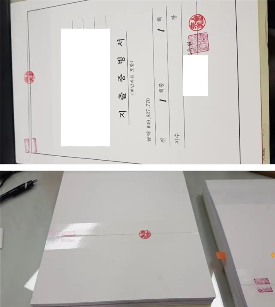 이후, 아래처럼 일상경비출납원 / 관서 도장을 찍고 보호용 필름 (또는 테이브) 을 안쪽에 겹치는 부분에 붙인다.