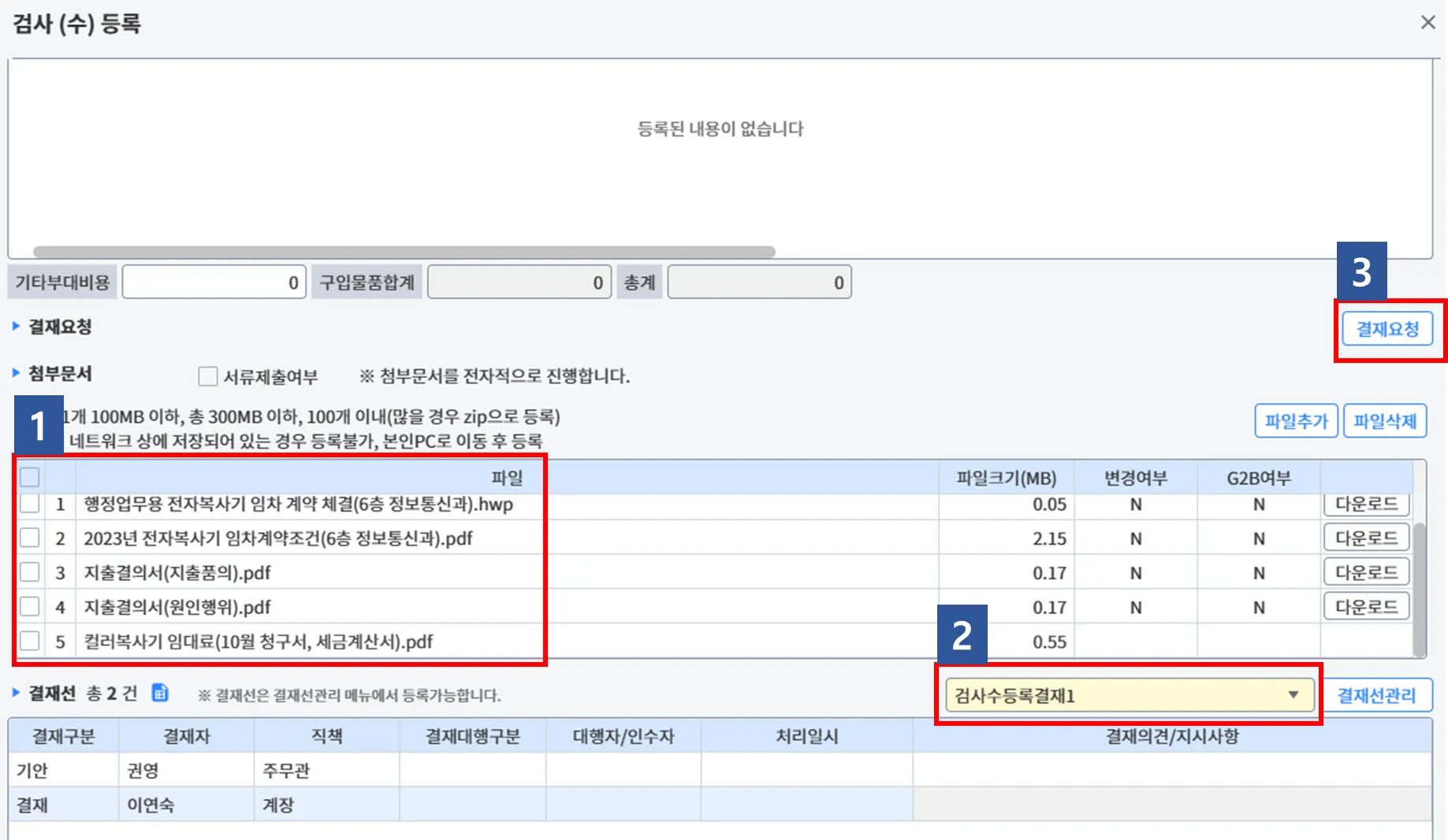 (1-3) 하단에 첨부파일과 결재라인을 정하고 [결재요청] 을 클릭