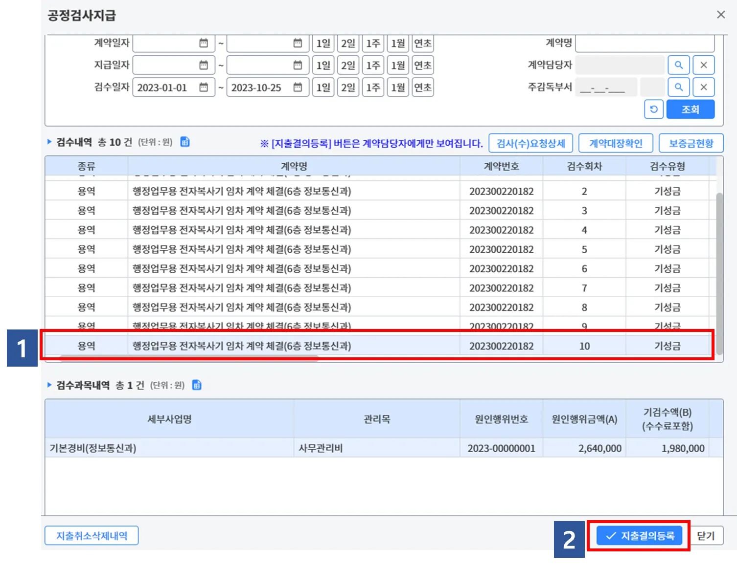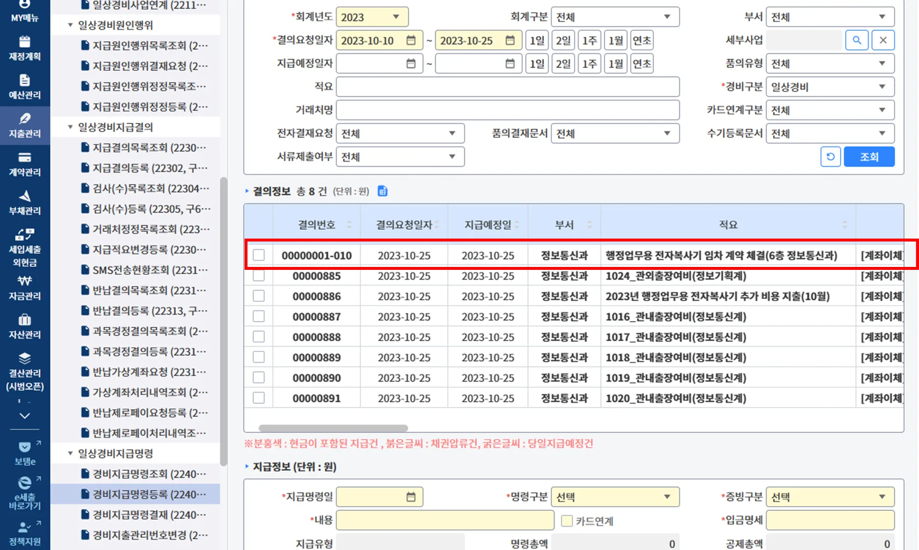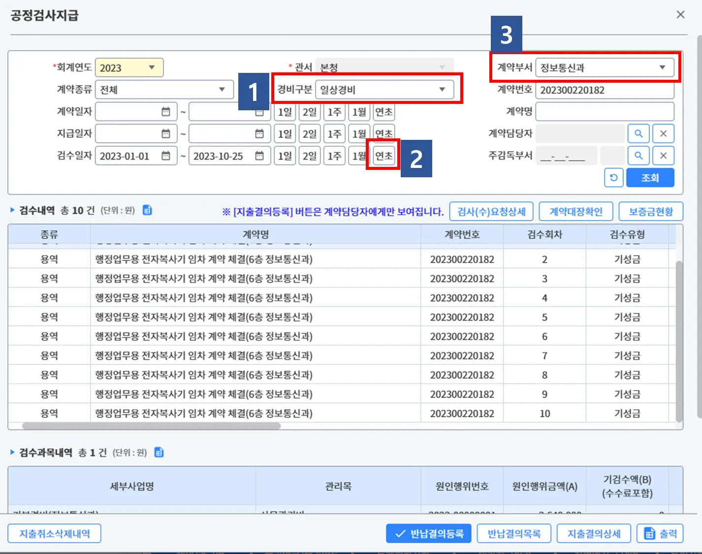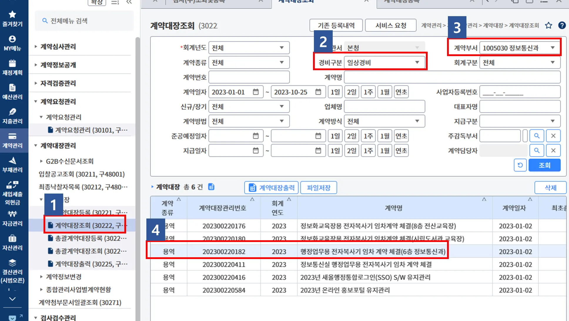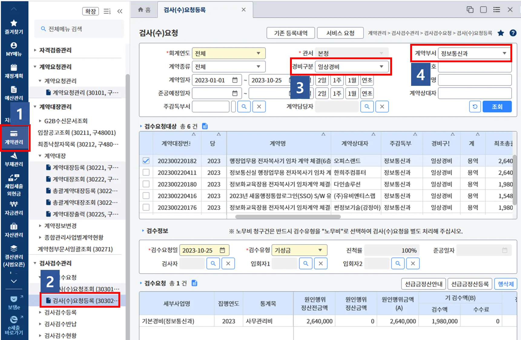 (3-4) 경비구분을 일상경비, 계약부서를 정보통신과로 선택 후 조회