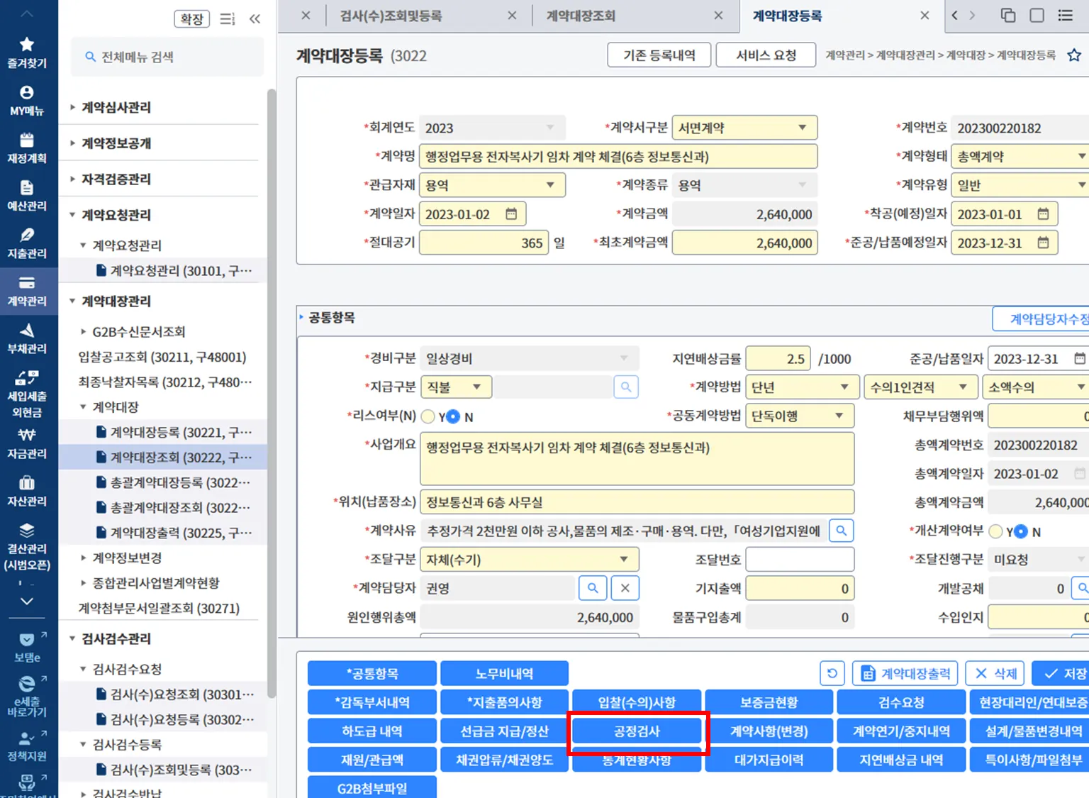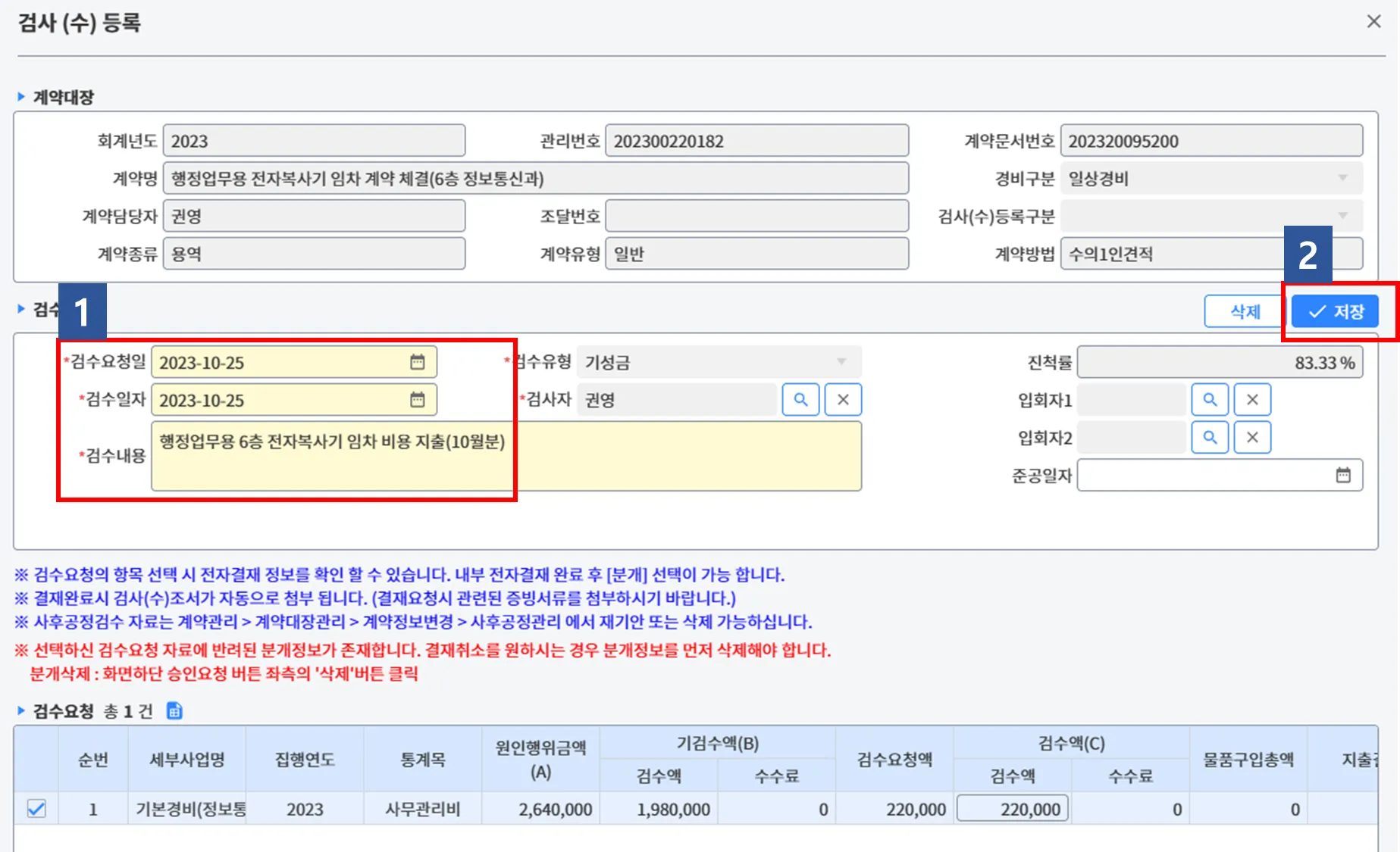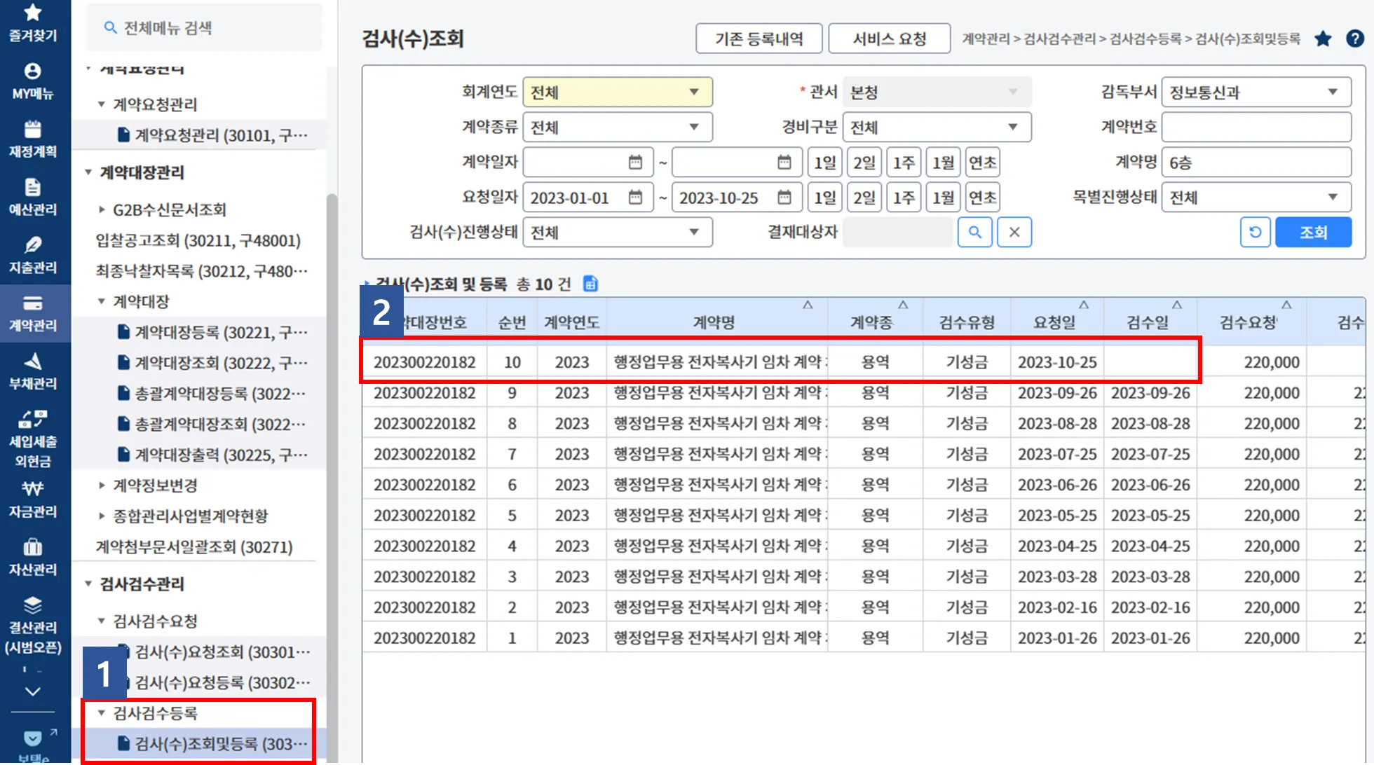 (1-2) 이후, 계약관리 > 검사검수관리 > 검사검수등록 > 검사(수)조회및등록 > 해당 계약건을 찾아 클릭