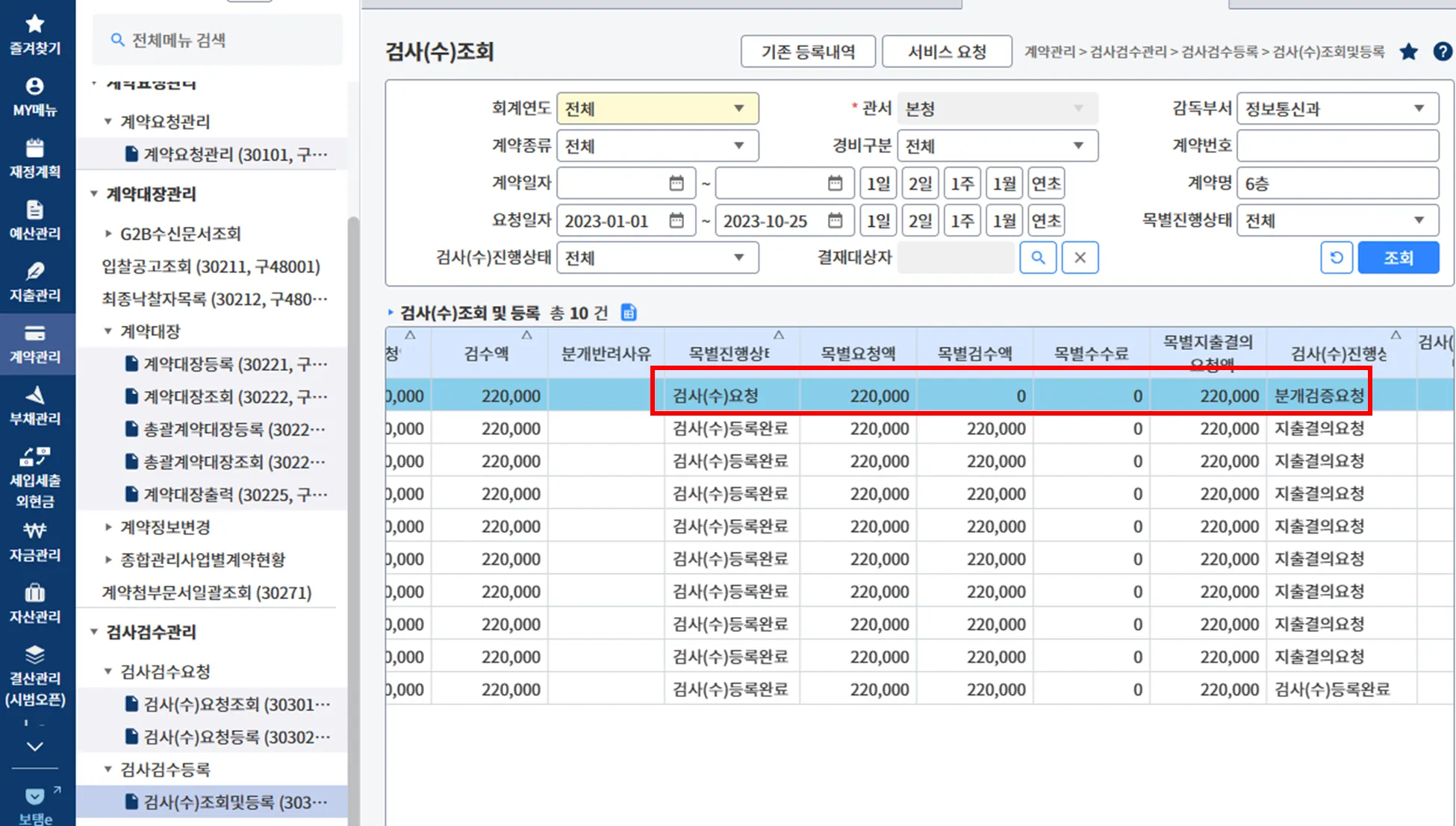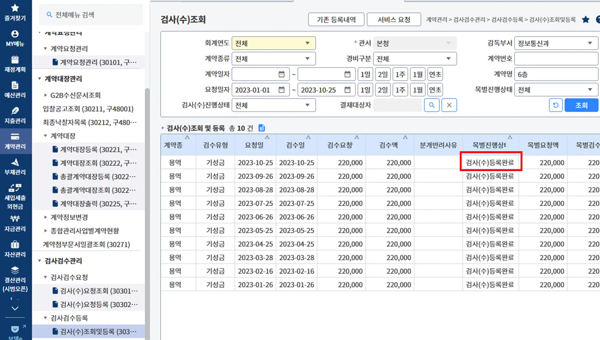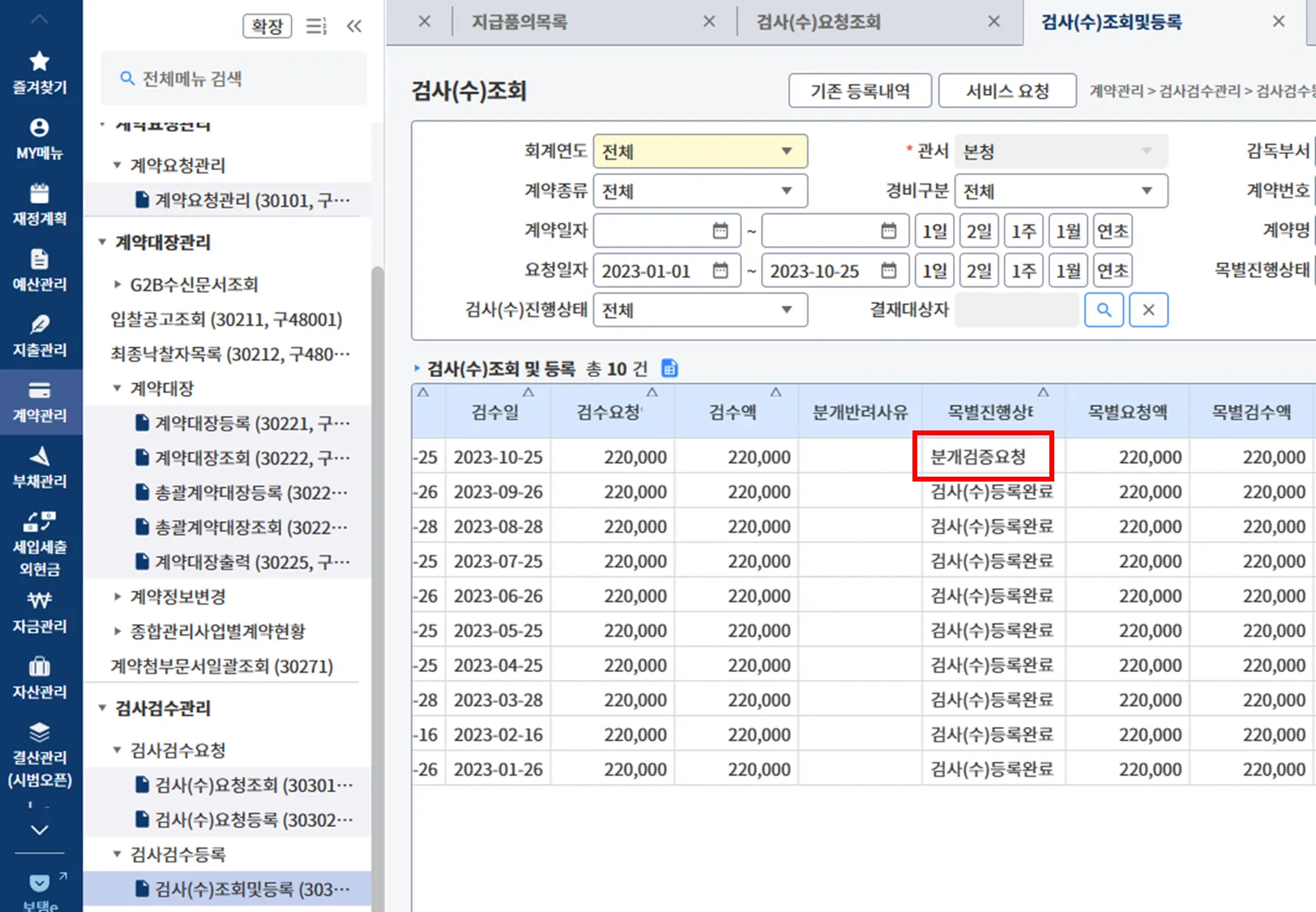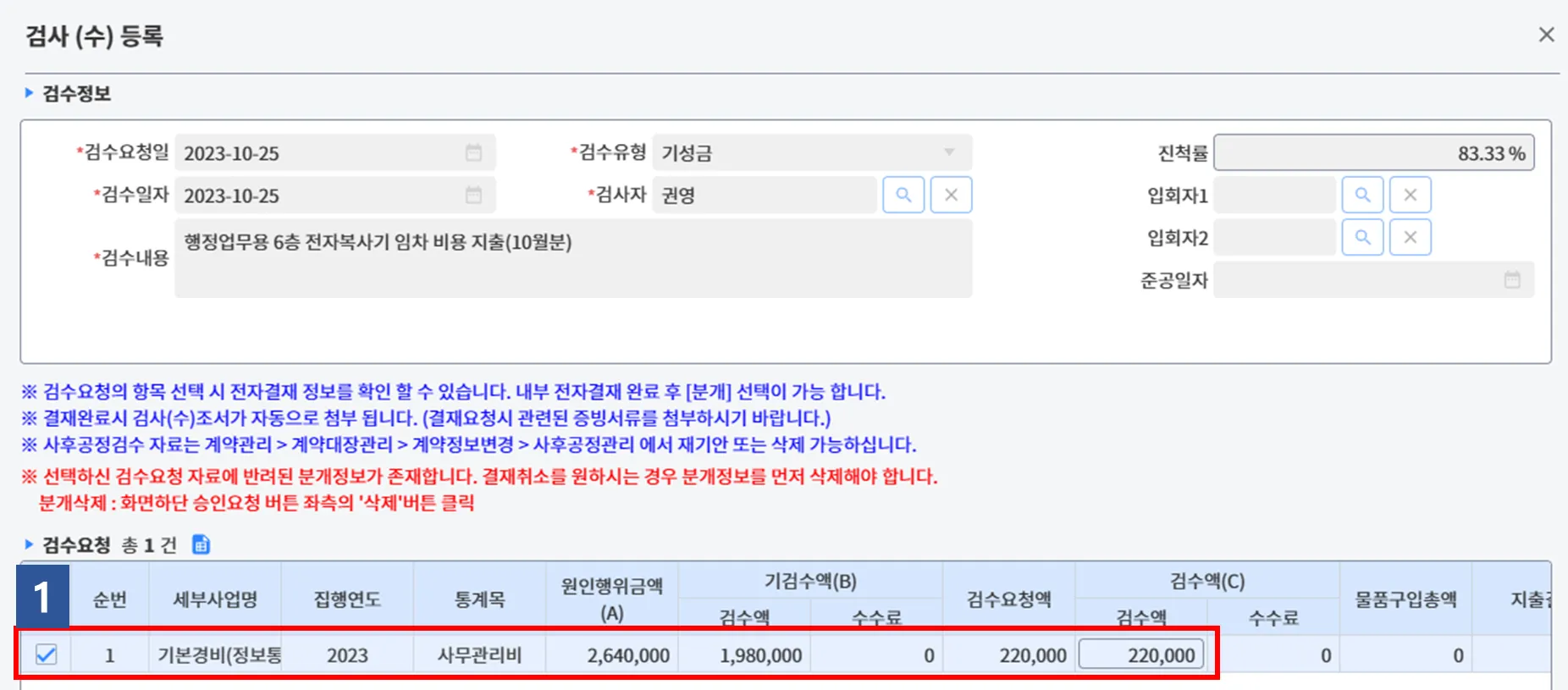 (1-2) 이후, 계약관리 > 검사검수관리 > 검사검수등록 > 검사(수)조회및등록 > 해당 계약건을 찾아 클릭