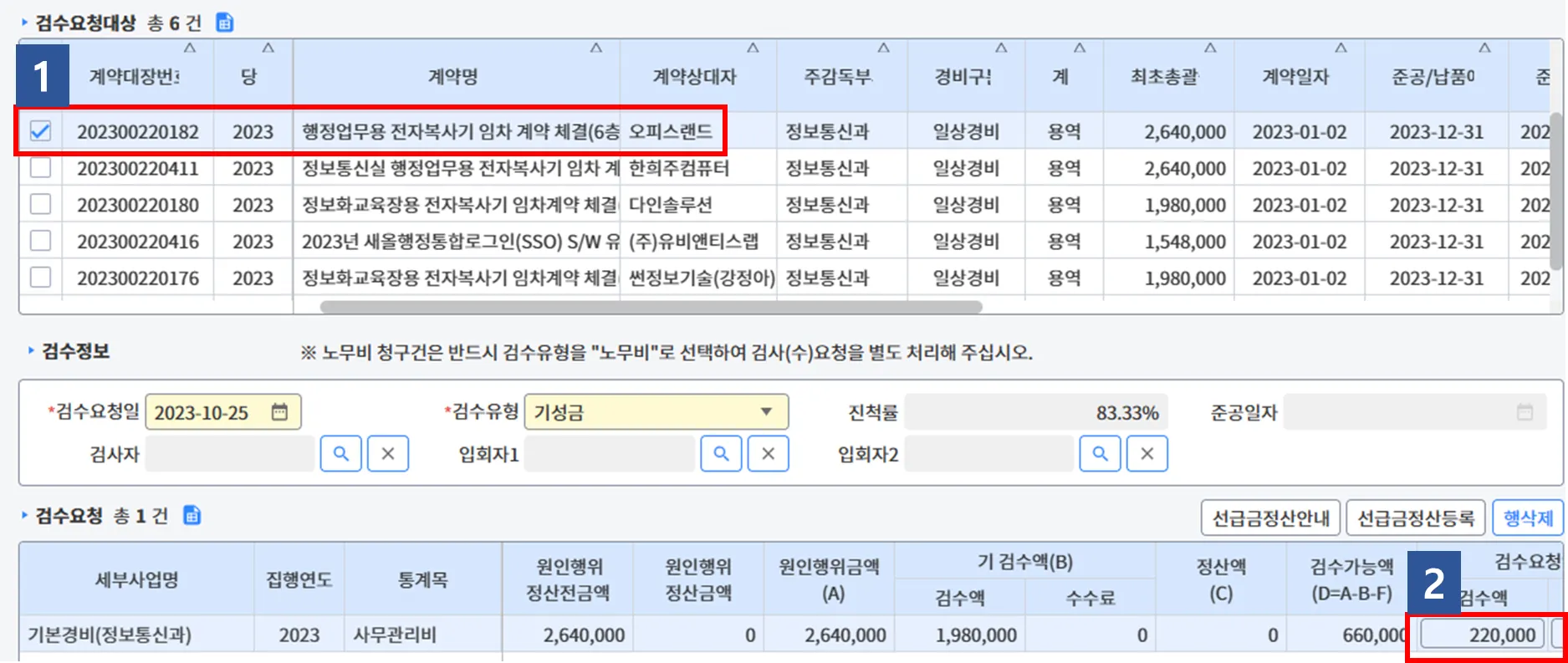 (1) 행정업무용 전자복사기 임차 계약 체결(6층 오피스랜드) 선택,