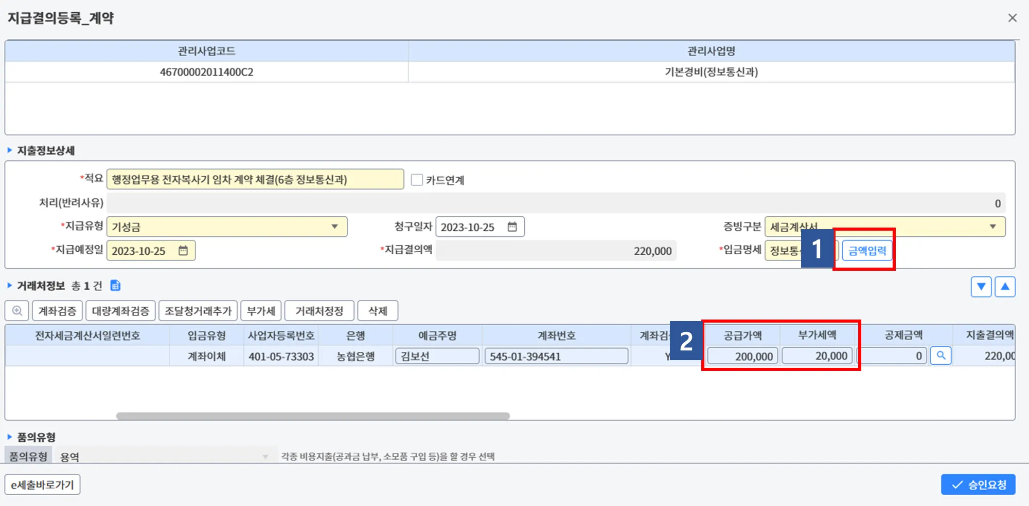 [지출결의등록] 후에 아래처럼 [금액입력, 공금가액, 부가세액] 을 수정하고 [승인요청] 을 하면 된다.