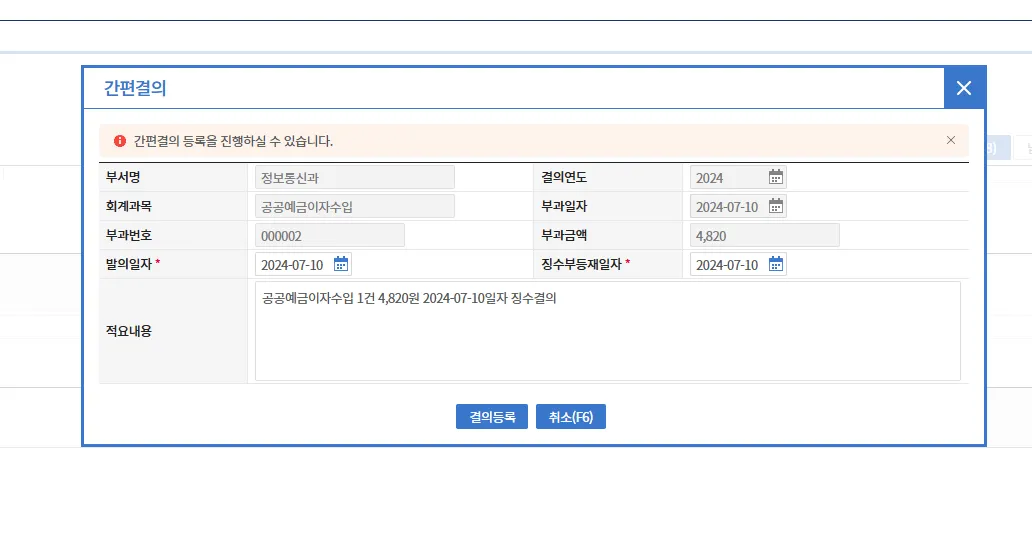 (7) 우측 상단 [저장] 클릭한 후 [결의등록]