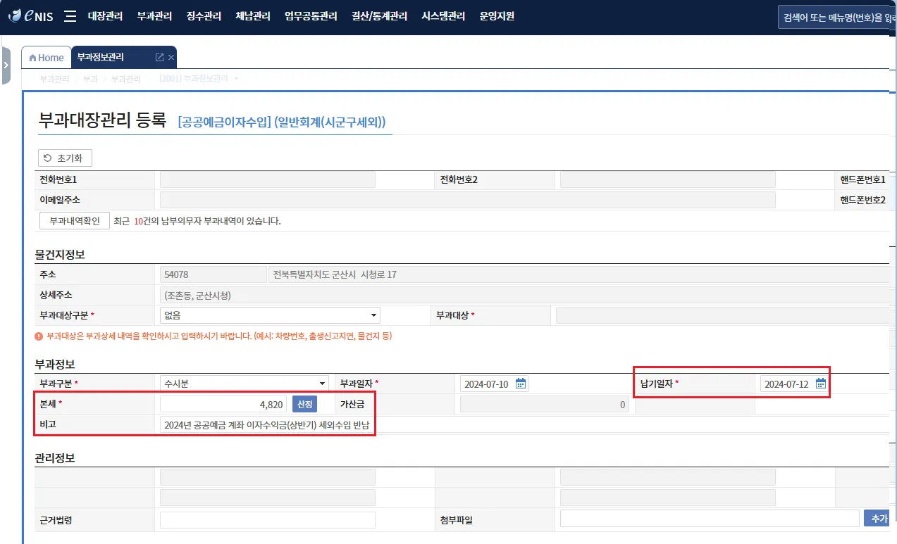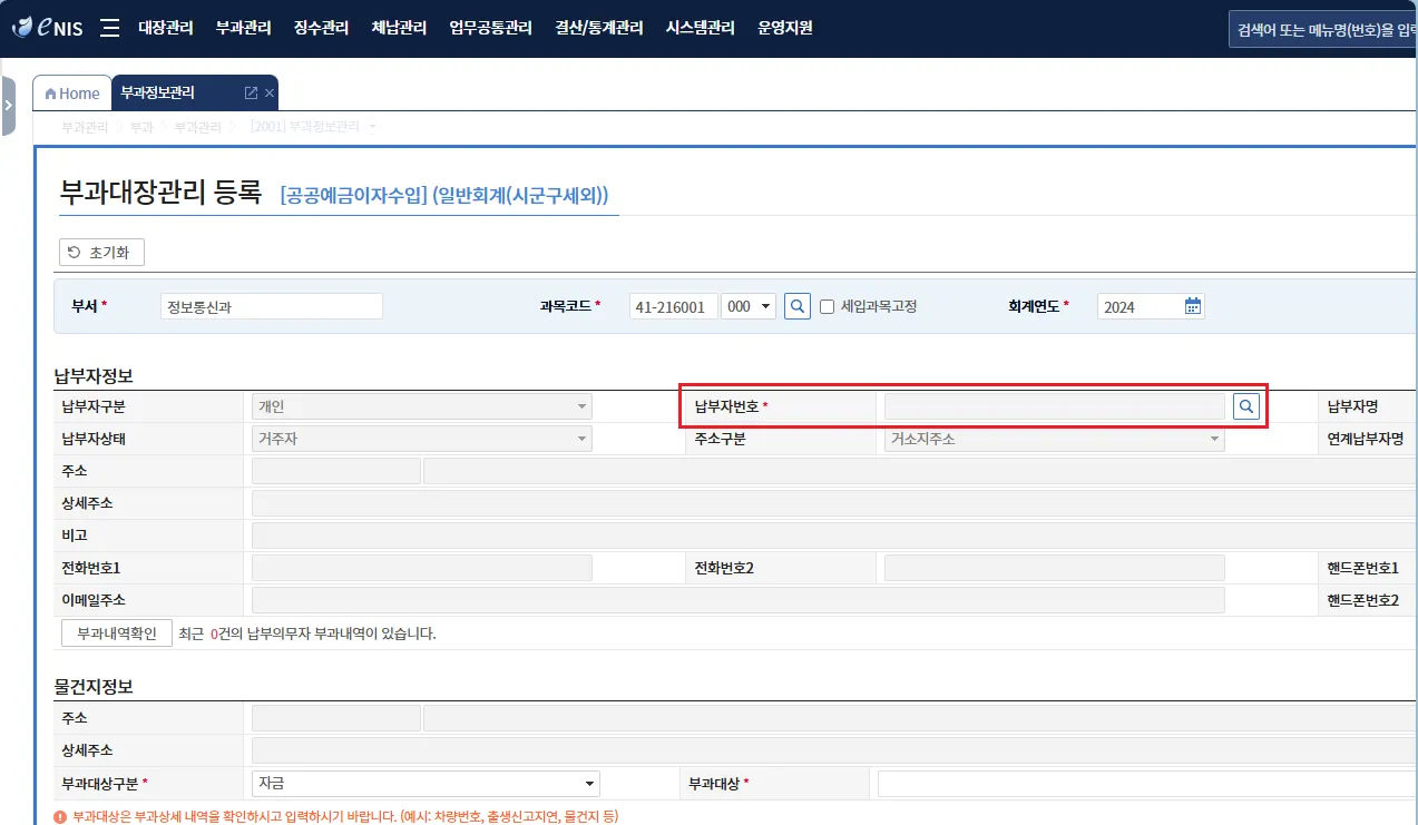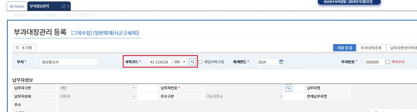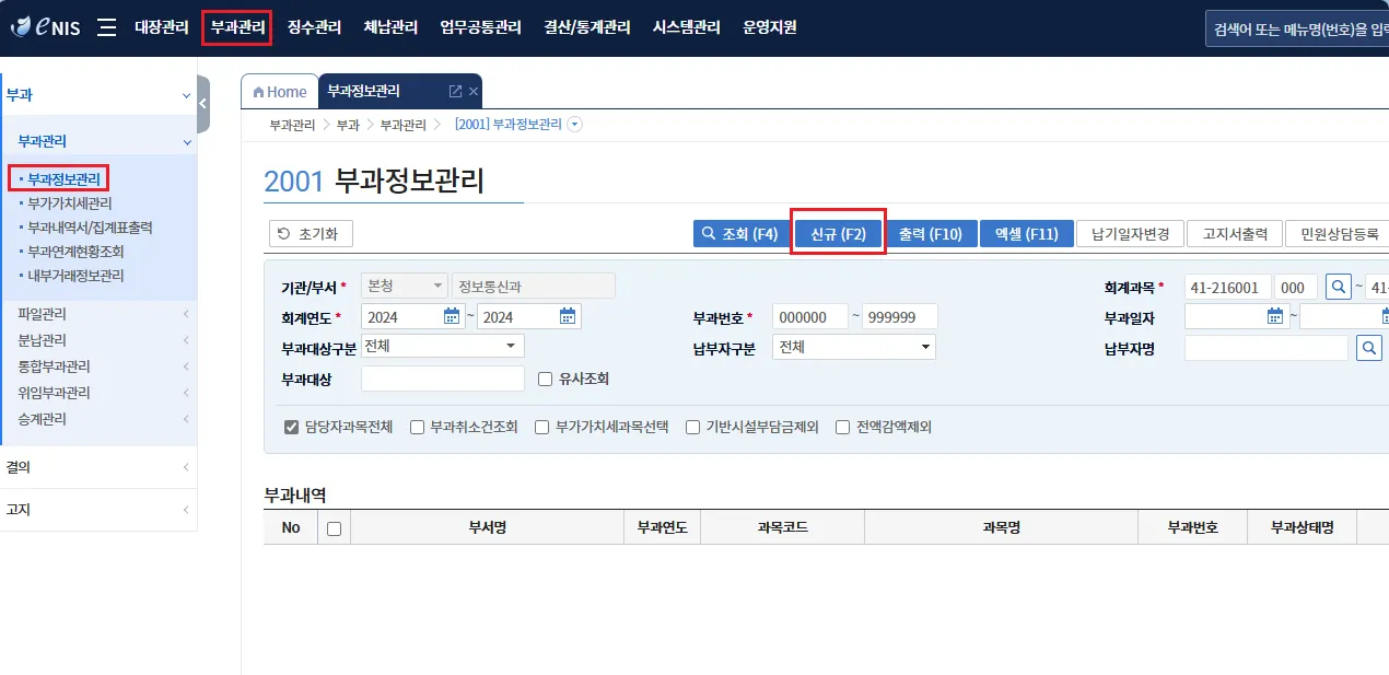 (1) 차세대세외수입 > 부과관리 > 부과정보관리 > 신규[F2]