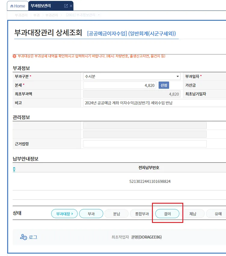 (1-1) 아래처럼 [과목코드] 에서 예금이자수입인지 그외수납인지 설정해야 한다.