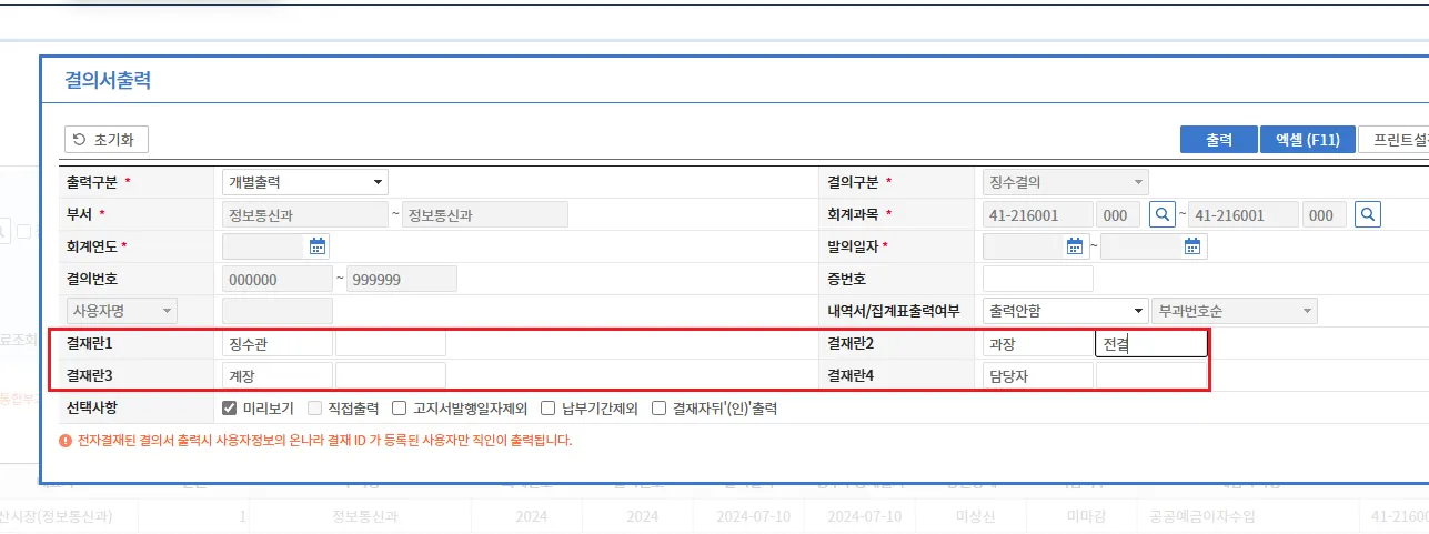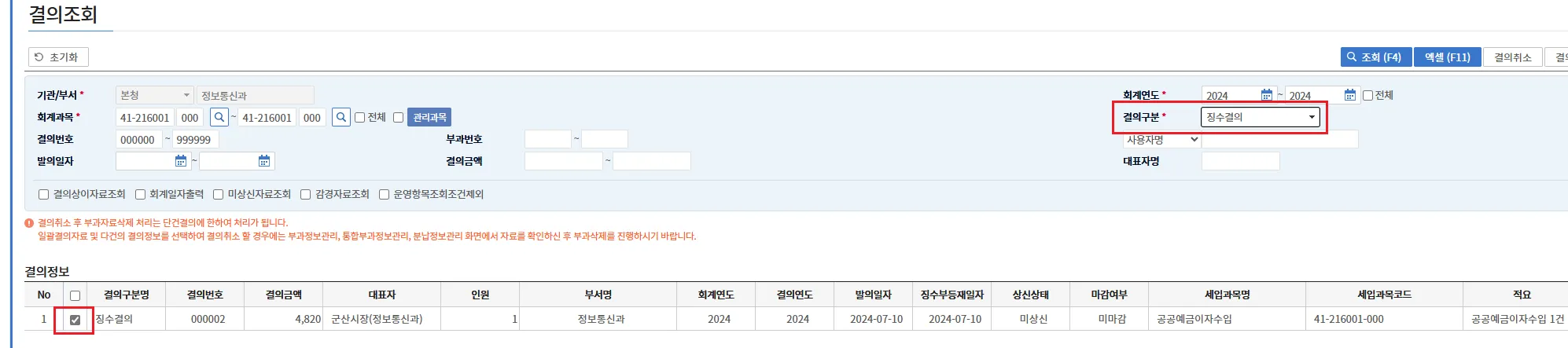 (9) 결의구분을 [징수결의]로 선택후 [결의서 출력]