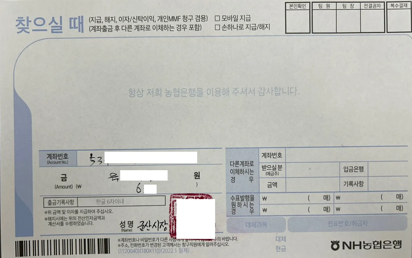 은행갈땐, 고지서, (회계과 도장이 찍힌) 전표만 가지고 가면 된다.