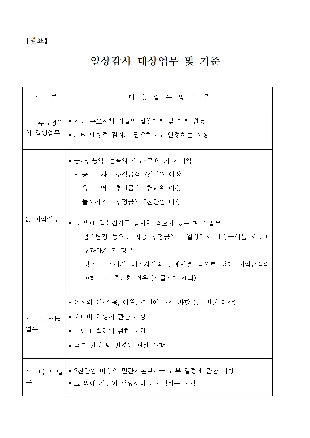 담당하는 업무(사업)에서 기준에 따라 일상감사를 받아야 하는지에 대한 요약 자료임.