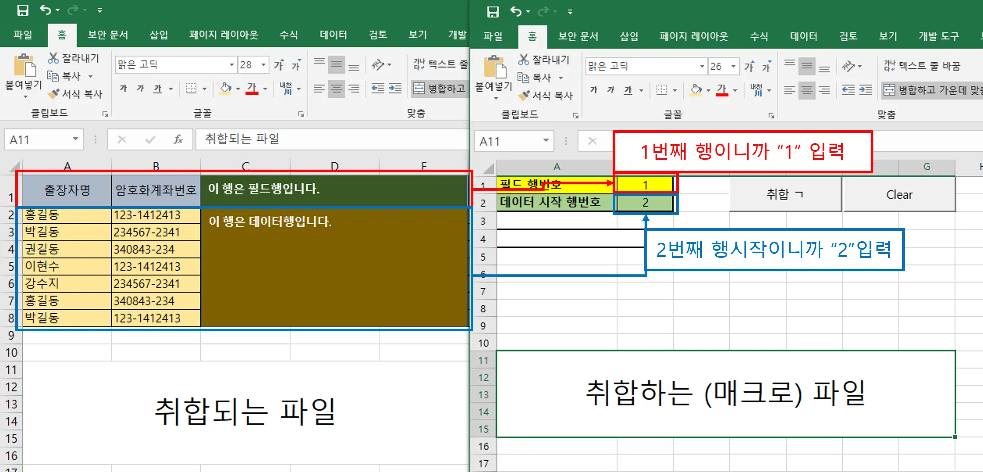 데이터행은 아래 예시에서 홍길동, 123-1412 …. 즉 2번째 행부터 해당된다. | 데이터행 번호를 아래 예시라면 ‘2’를 입력한다. 이후 [취합ㄱ] 클릭 |